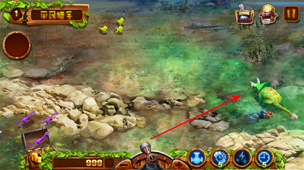 1、瞄準恐龍,在場景中鎖定綠色恐龍等目標,調(diào)整射擊角度,為攻擊做好準備。