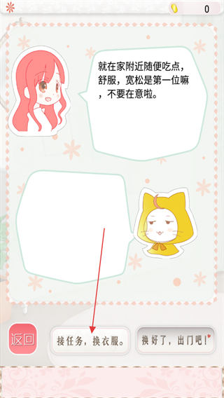 1、閱讀對(duì)話文本,了解在家附近就餐及穿著要舒適寬松的建議后,點(diǎn)擊接任務(wù),換衣服按鈕。