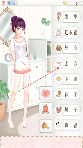 3、點(diǎn)擊右側(cè)服裝分類(lèi)欄中的上衣,挑選喜歡的上衣為角色搭配。