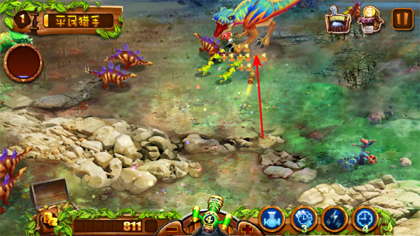 2、攻擊大型恐龍,瞄準(zhǔn)場(chǎng)景中的大型彩色恐龍,發(fā)起攻擊,造成大量傷害,獲取更多分?jǐn)?shù)和資源。