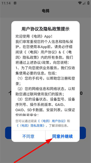 1、在用戶協(xié)議及隱私政策提示彈窗中,點(diǎn)擊同意并繼續(xù),進(jìn)入頁(yè)面。