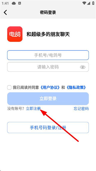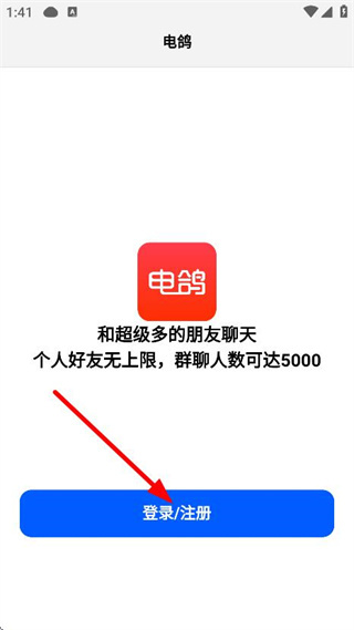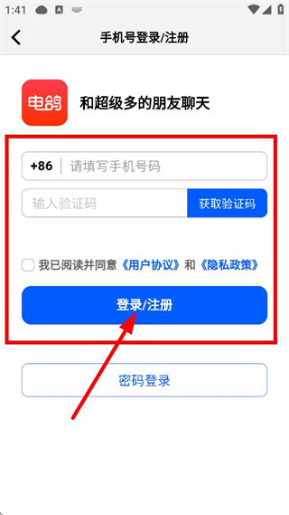 2、在電鴿登錄注冊(cè)引導(dǎo)頁(yè)面,點(diǎn)擊登錄注冊(cè),進(jìn)入密碼登錄頁(yè)面。