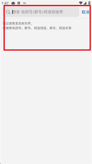 4、在搜索頁面,可輸入電鴿號(hào)、群號(hào)、頻道鏈接等進(jìn)行搜索。