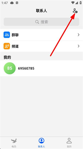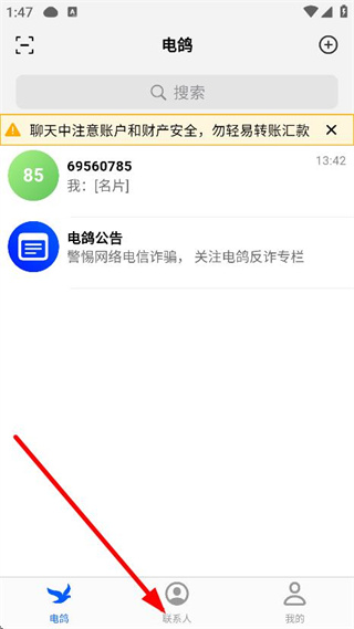 1、在電鴿主界面,點(diǎn)擊底部的聯(lián)系人,進(jìn)入聯(lián)系人頁面。