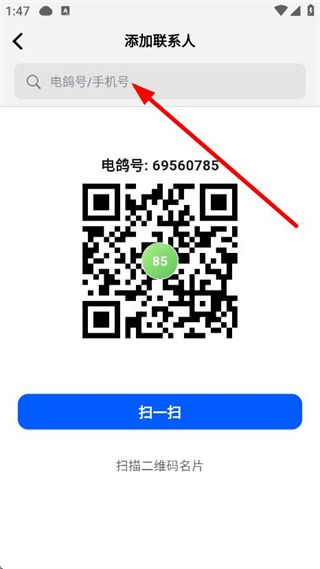3、在添加聯(lián)系人頁面,點(diǎn)擊電鴿號(hào)手機(jī)號(hào)搜索框,進(jìn)入搜索頁面。