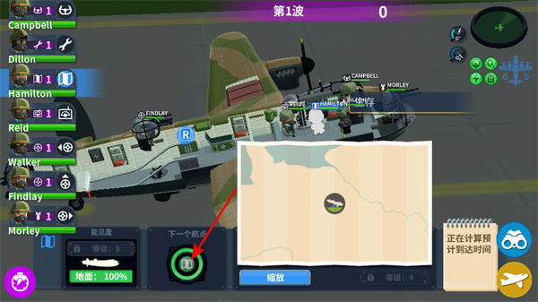 1、規(guī)劃路線,在地圖界面,點擊下一個據(jù)點按鈕,規(guī)劃戰(zhàn)機的飛行路線,明確任務推進方向。