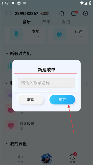 3、在新建歌單窗口,輸入歌單名稱后,點擊確定,完成歌單創(chuàng)建。