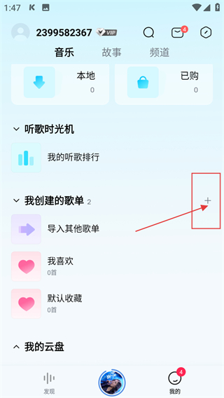 2、在個人頁面,點擊我創(chuàng)建的歌單旁的+號,彈出新建歌單窗口。