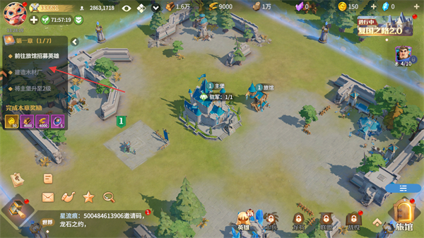 4、查看左側(cè)任務(wù)提示,如前往旅館招募英雄,按指引前往對(duì)應(yīng)建筑,完成任務(wù)獲取資源和英雄。