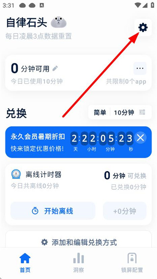 2、在自律石頭主界面,點(diǎn)擊右上角的設(shè)置圖標(biāo),進(jìn)入設(shè)置頁面。