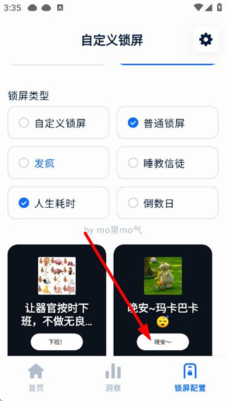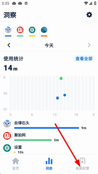 1、在洞察頁(yè)面,點(diǎn)擊底部的鎖屏配置,進(jìn)入自定義鎖屏頁(yè)面。
