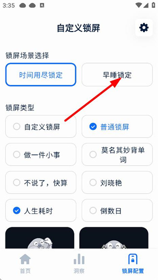 2、在自定義鎖屏頁(yè)面,鎖屏場(chǎng)景選擇可點(diǎn)擊早睡鎖定。