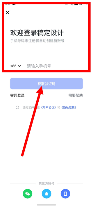 3、進(jìn)入歡迎登錄稿定設(shè)計頁面,輸入手機(jī)號后,點擊獲取驗證碼。