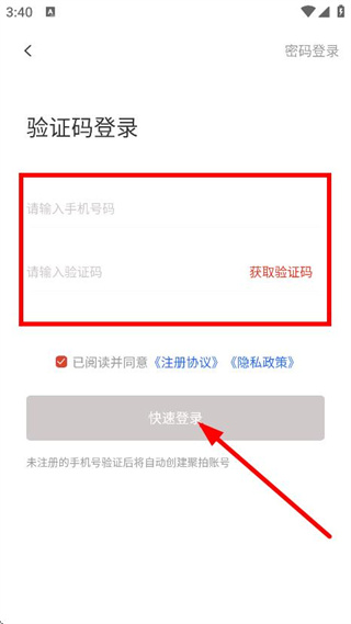 4、在登錄頁面,選擇驗證碼登錄,輸入手機號、驗證碼,點擊快速登錄,完成登錄。