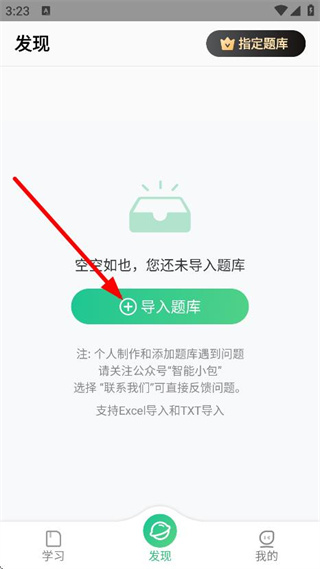 2、在發(fā)現(xiàn)頁(yè)面,點(diǎn)擊導(dǎo)入題庫(kù),進(jìn)入選擇文檔頁(yè)面。