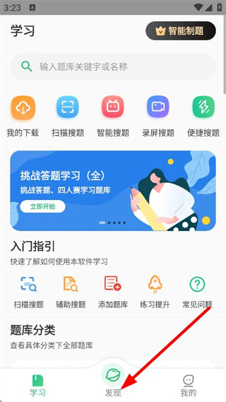 1、在學(xué)習(xí)頁(yè)面,點(diǎn)擊底部的發(fā)現(xiàn),進(jìn)入發(fā)現(xiàn)頁(yè)面。