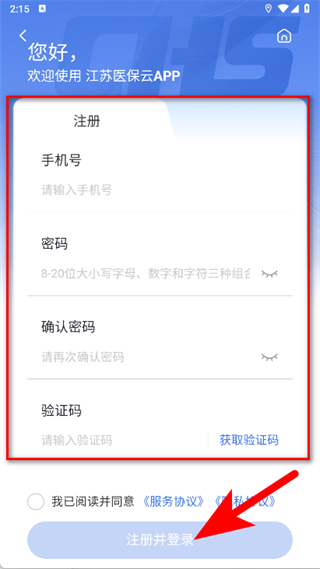 4、依次輸入手機(jī)號,獲取并輸入驗(yàn)證碼等信息,勾選同意相關(guān)協(xié)議后,點(diǎn)擊注冊并登錄,完成注冊。