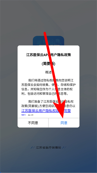 1、打開江蘇醫(yī)保云APP,在用戶隱私政策彈窗中點(diǎn)擊同意。