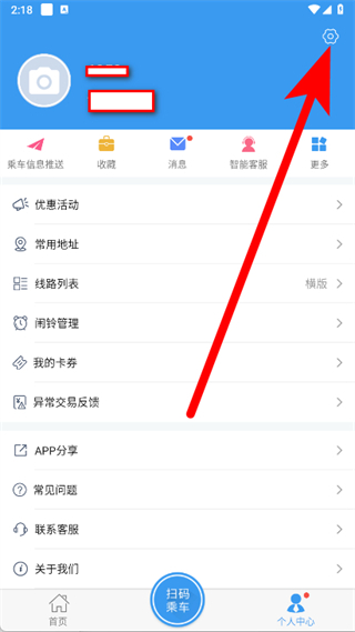 1、打開(kāi)月城公交,進(jìn)入個(gè)人中心頁(yè)面,點(diǎn)擊右上角設(shè)置圖標(biāo)。