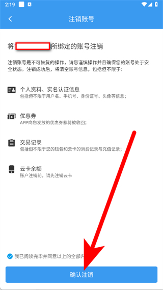 3、進(jìn)入注銷賬號(hào)頁(yè)面,勾選同意相關(guān)內(nèi)容后,點(diǎn)擊確認(rèn)注銷。