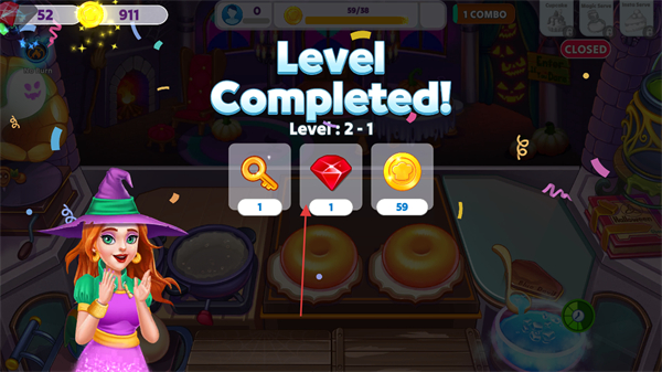 4、完成本關卡所有訂單,出現LevelCompleted!提示后,領取鑰匙,鉆石,金幣等通關獎勵,進入下一關。