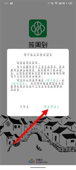 1、打開(kāi)蘇周到APP,在彈窗中點(diǎn)擊同意并進(jìn)入。