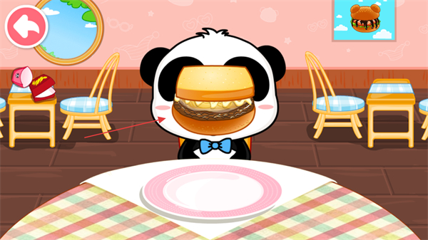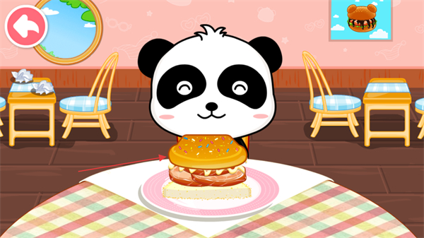 4、將制作好的漢堡呈現(xiàn)給熊貓角色,讓它享用,完成一次美食制作任務(wù)。