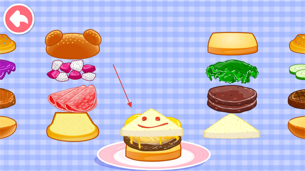 2、切換到食材選擇界面,從眾多食材中挑選心儀的食材,比如芝士、肉餅等,點(diǎn)擊食材拖放到盤子上進(jìn)行組合。