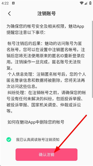 4、在注銷(xiāo)賬號(hào)說(shuō)明頁(yè)面,勾選同意相關(guān)須知后,點(diǎn)擊確認(rèn)注銷(xiāo),進(jìn)行賬號(hào)注銷(xiāo)操作。