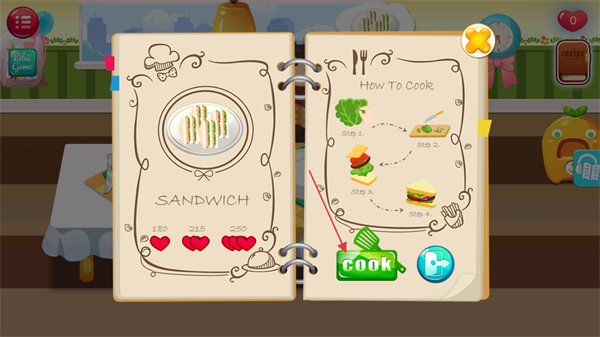 2、查看菜譜,了解制作SANDWICH的步驟后點擊COOK按鈕開始制作。