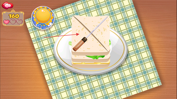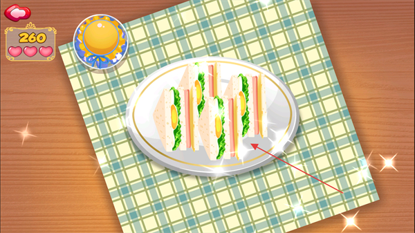 4、完成切割,做出擺盤好看的三明治,獲取分?jǐn)?shù)如260,上菜給顧客。