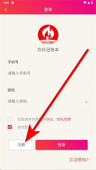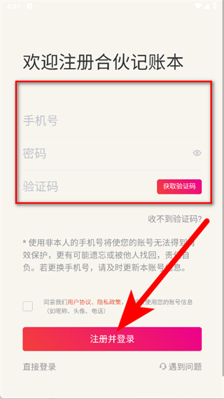 4、填寫手機號、密碼等信息,勾選同意協(xié)議后,點擊注冊并登錄,完成注冊。