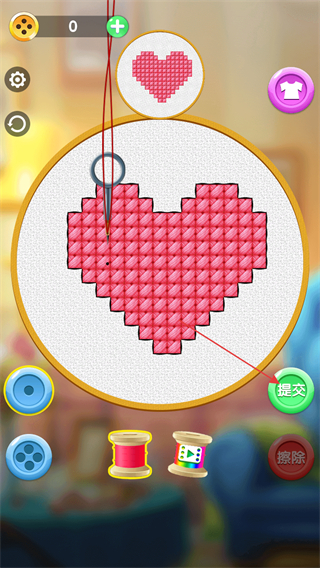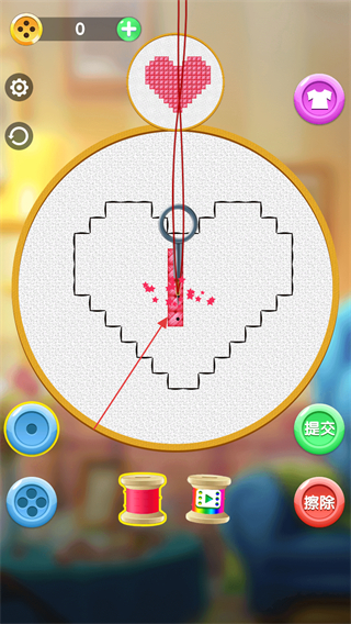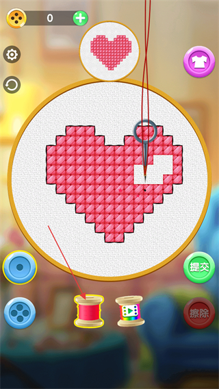 1、進(jìn)入游戲,參考上方心形圖案樣式,選擇合適顏色的線團(tuán),點(diǎn)擊屏幕進(jìn)行刺繡。