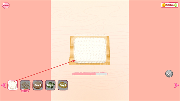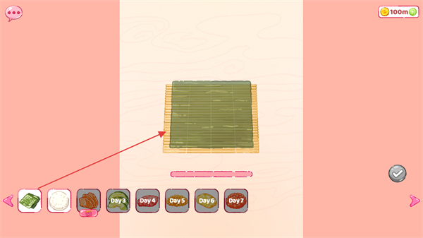 1、進入游戲,點擊下方食材欄中的海苔,放置到竹簾上開始制作壽司。