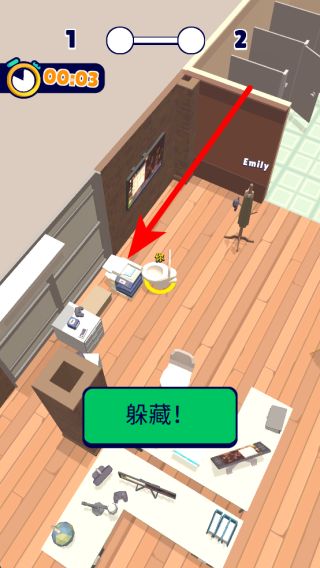 2、進入后,會處于有諸多物品的場景中,需快速觀察周圍,找到合適的隱藏點,比如圖中的馬桶等物品旁,點擊躲藏按鈕,讓自己融入環(huán)境,避免被追捕者發(fā)現(xiàn)。