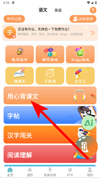 1、打開快樂聽寫APP,在主頁點擊用心背課文。