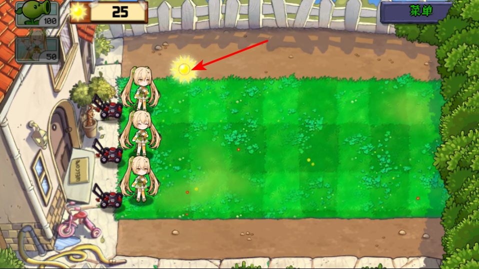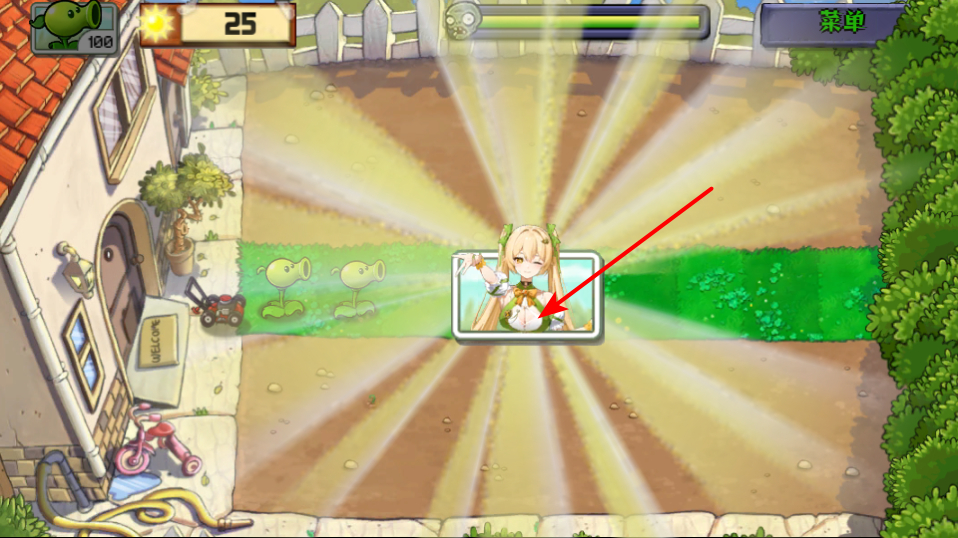 2、種植植物娘,在綠色草坪區(qū)域種植植物娘如豌豆射手,構(gòu)建防御陣線,抵御僵尸進(jìn)攻。