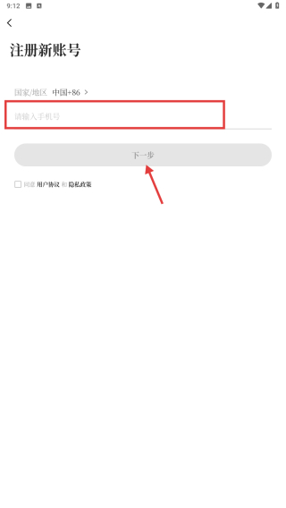 4、在注冊新賬號頁面,輸入手機號碼后點擊下一步按鈕,完成注冊流程的第一步操作。