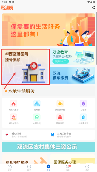 2、打開(kāi)政務(wù)服務(wù)類應(yīng)用,點(diǎn)擊華西空港區(qū)醫(yī)院掛號(hào)就診入口,進(jìn)入預(yù)約掛號(hào)頁(yè)面。