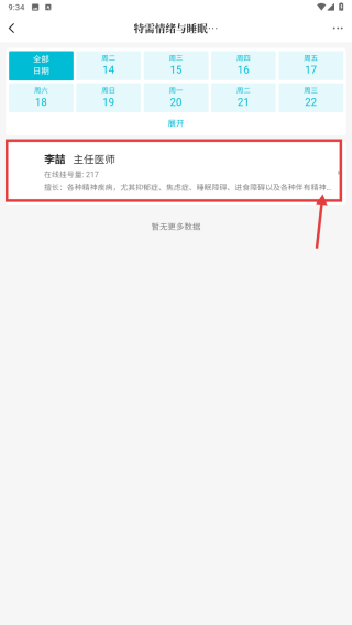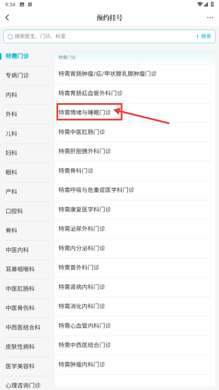 3、在預(yù)約掛號(hào)頁(yè)面,選擇特需情緒與睡眠門(mén)診分類,進(jìn)入門(mén)診詳情頁(yè)。