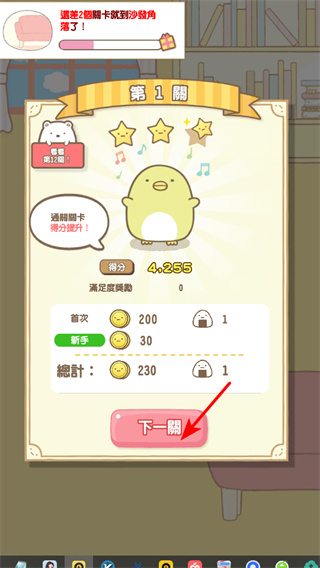 4、完成每一關的消除任務,獲得分數和獎勵,點擊下一關繼續(xù),不斷積累經驗以實現升級。