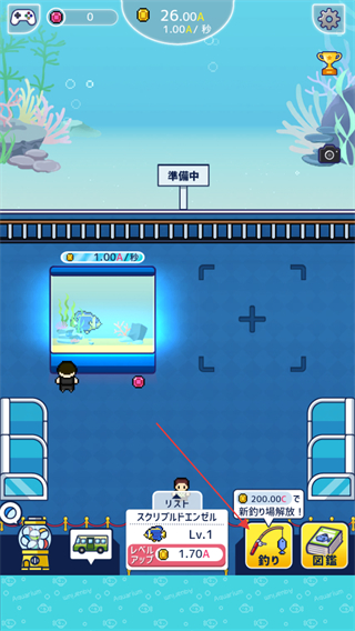 1、進(jìn)入游戲界面,查看上方金錢數(shù)值26.00A等信息,點(diǎn)擊下方類似購買按鈕解鎖釣魚功能。