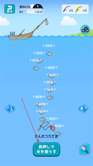 2、進(jìn)入釣魚界面,長按屏幕下方長押して糸を垂らす長按放下魚線按鈕,放下魚線開始釣魚。
