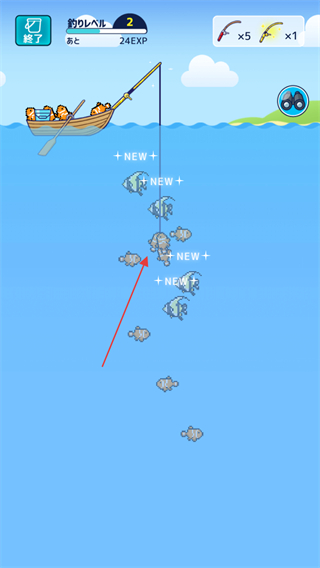 3、魚上鉤后,松開按鈕收線,釣到不同種類的魚,提升釣魚等級。