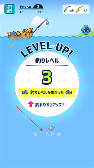 4、當(dāng)出現(xiàn)LEVELUP!提示,等級提升如到3級,點(diǎn)擊TAP繼續(xù)游戲,重復(fù)釣魚等操作,收集更多魚類來通關(guān)。