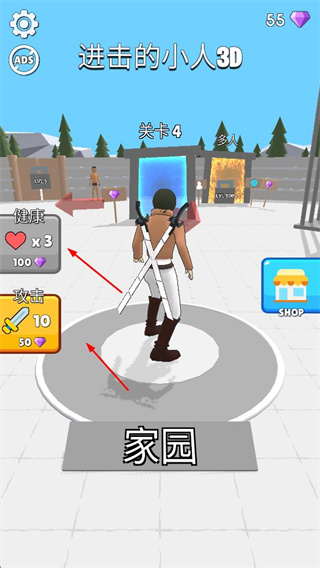 4、在家園等界面,可查看角色的健康、攻擊等屬性,也能進(jìn)入關(guān)卡4等關(guān)卡繼續(xù)挑戰(zhàn),不斷提升角色實(shí)力,推進(jìn)游戲進(jìn)程。