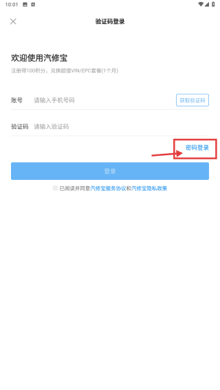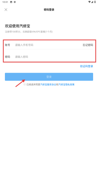 4、在密碼登錄頁面,輸入手機號碼和密碼后勾選已閱讀并同意汽修寶服務(wù)協(xié)議和汽修寶隱私政策,完成賬號登錄操作。