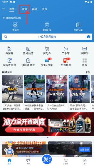 1、打開(kāi)汽車(chē)服務(wù)類(lèi)應(yīng)用,點(diǎn)擊頂部商城選項(xiàng),進(jìn)入配件商城頁(yè)面。