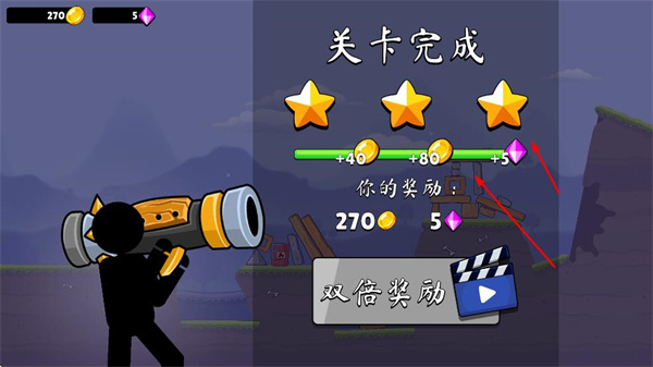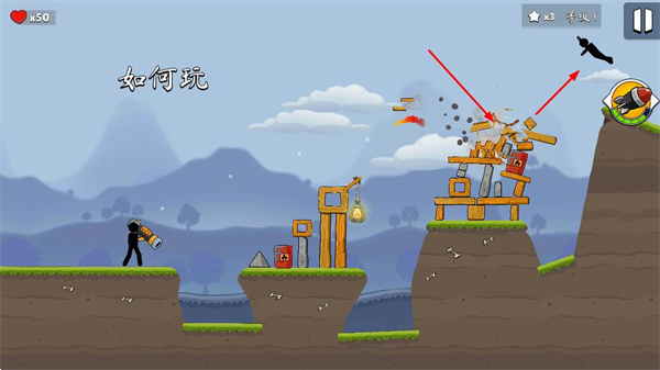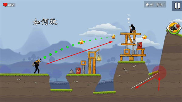1、操控火柴人使用武器,瞄準(zhǔn)目標(biāo)建筑發(fā)射,通過調(diào)整發(fā)射角度和力度,摧毀目標(biāo)建筑。