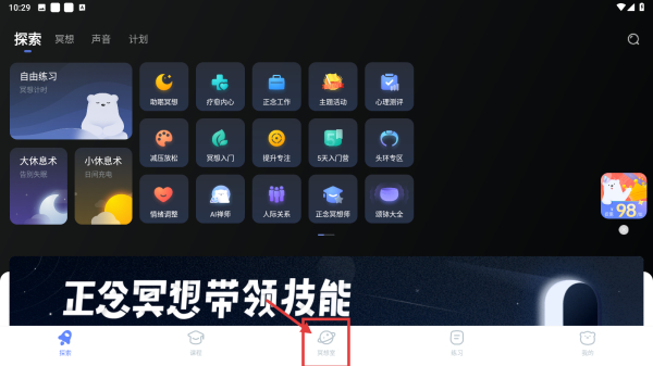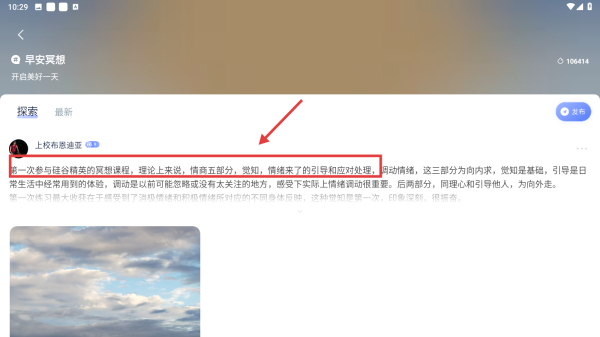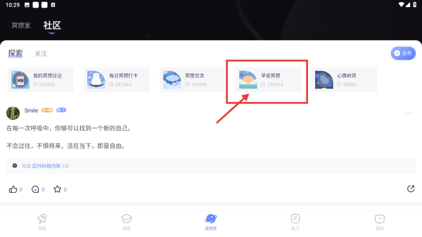 3、在社區(qū)探索區(qū),點(diǎn)擊早安冥想板塊,查看冥想課程及相關(guān)內(nèi)容。